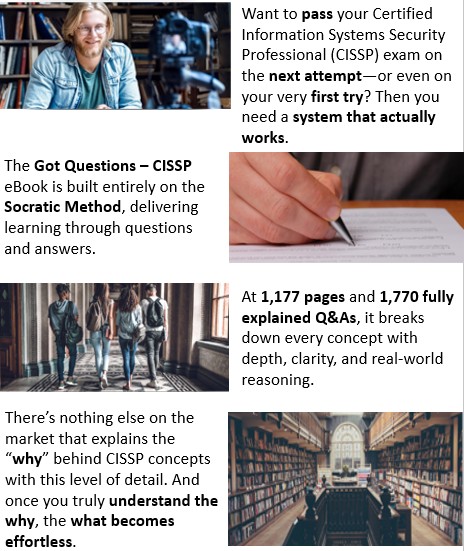 DISCLAIMER: The claims stated on this Got Questions - CISSP eBook landing page are our personal observations from previous or existing clients who passed after using this product. Please understand that while these results are typical, they are not guaranteed. Buy purchasing the Got Questions - CISSP eBook, you are receiving a non-refundable product that we believe has enough information to help you pass the CISSP on your next attempt. But there are no guarantees in life. Your results will vary and depend on many factors including but not limited to your background, experience, and work ethic. All business entails risk as well as massive and consistent effort and action. If you’re not willing to accept that, please DO NOT PURCHASE The Got Questions - CISSP eBook.